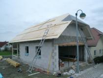 Der mit einem Krüppelwalmdach aufgerichtete Dachstuhl nimmt die Form einer bereits bestehenden Garage auf. |
